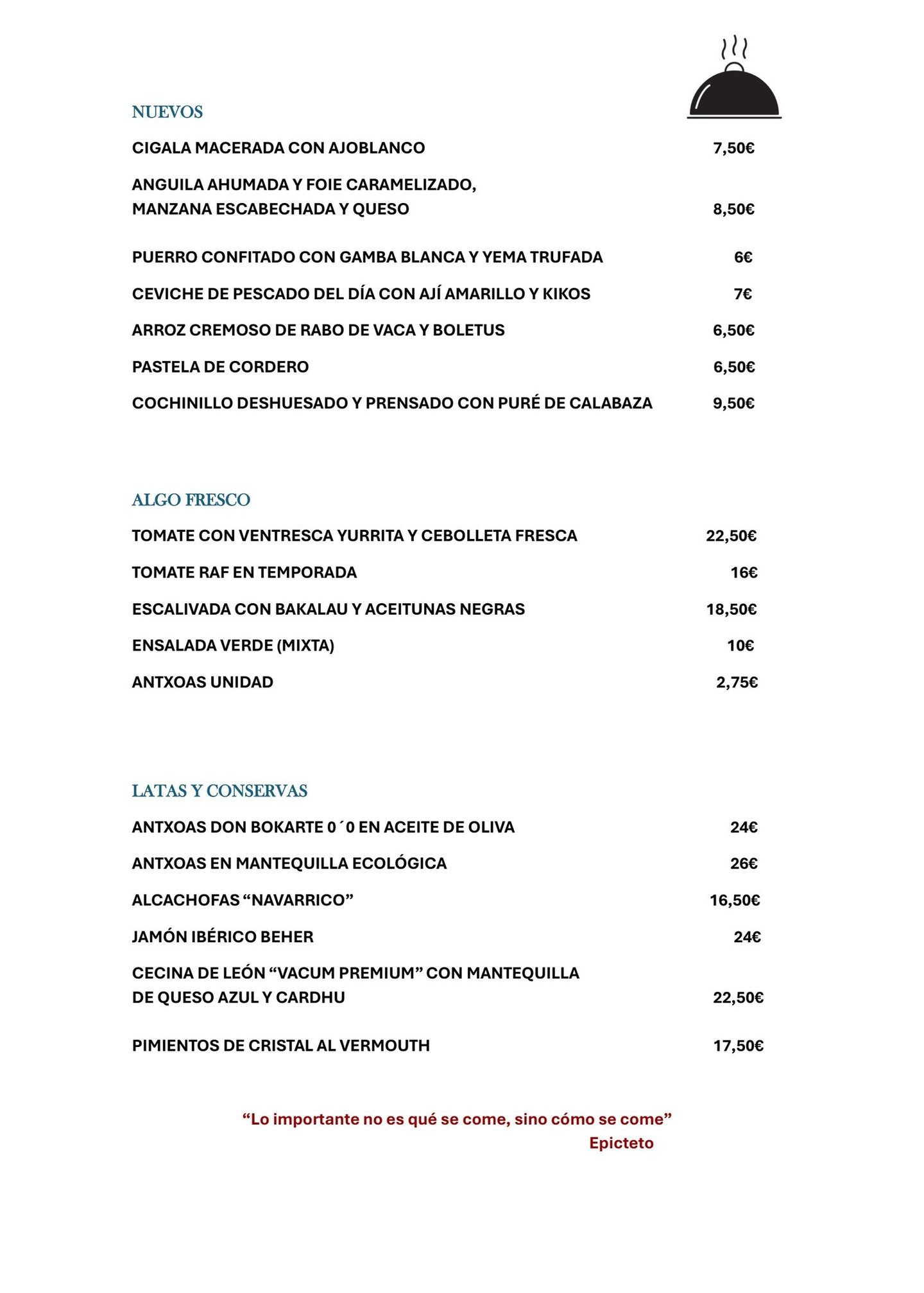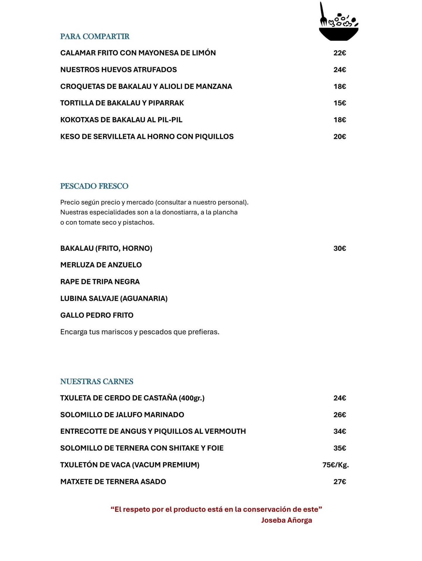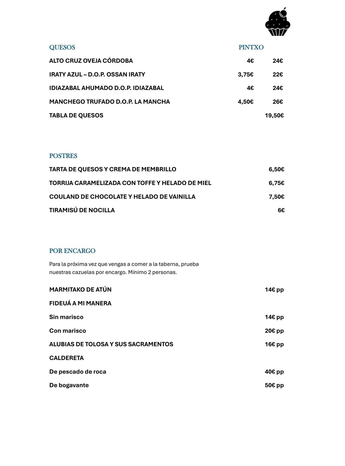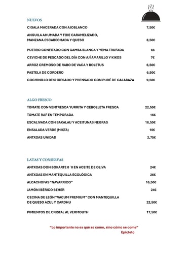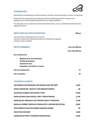 Carta de pintxos y platos